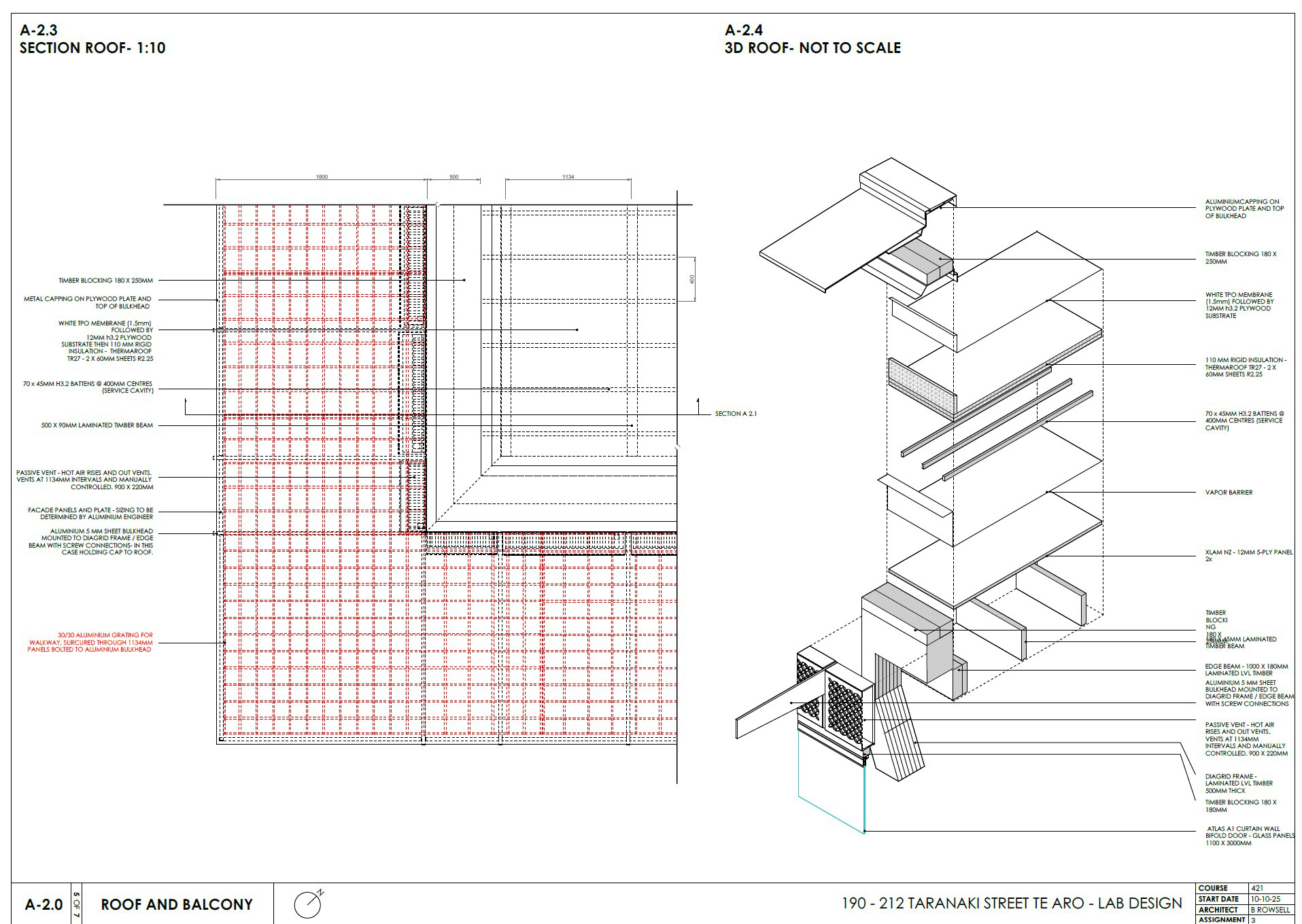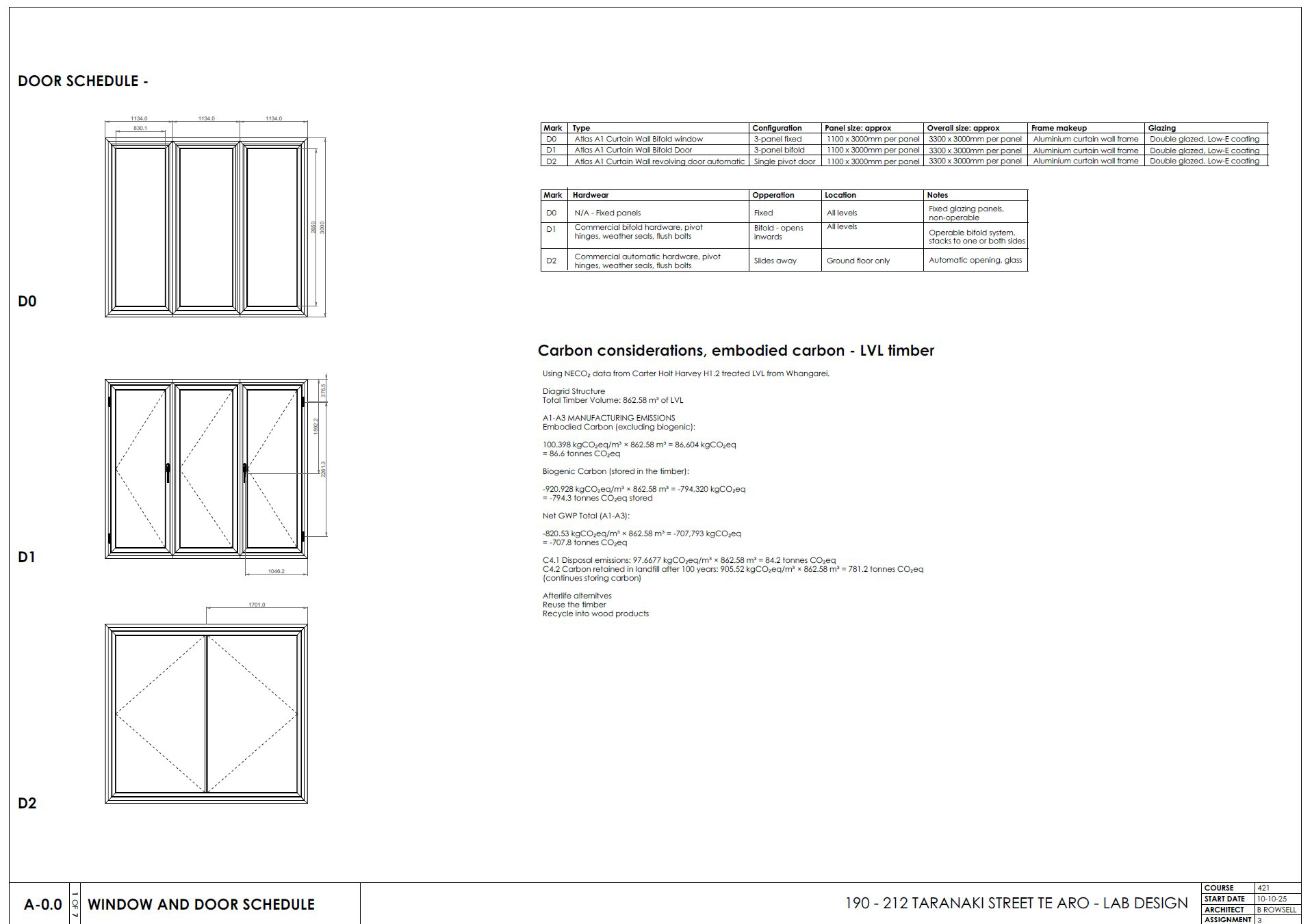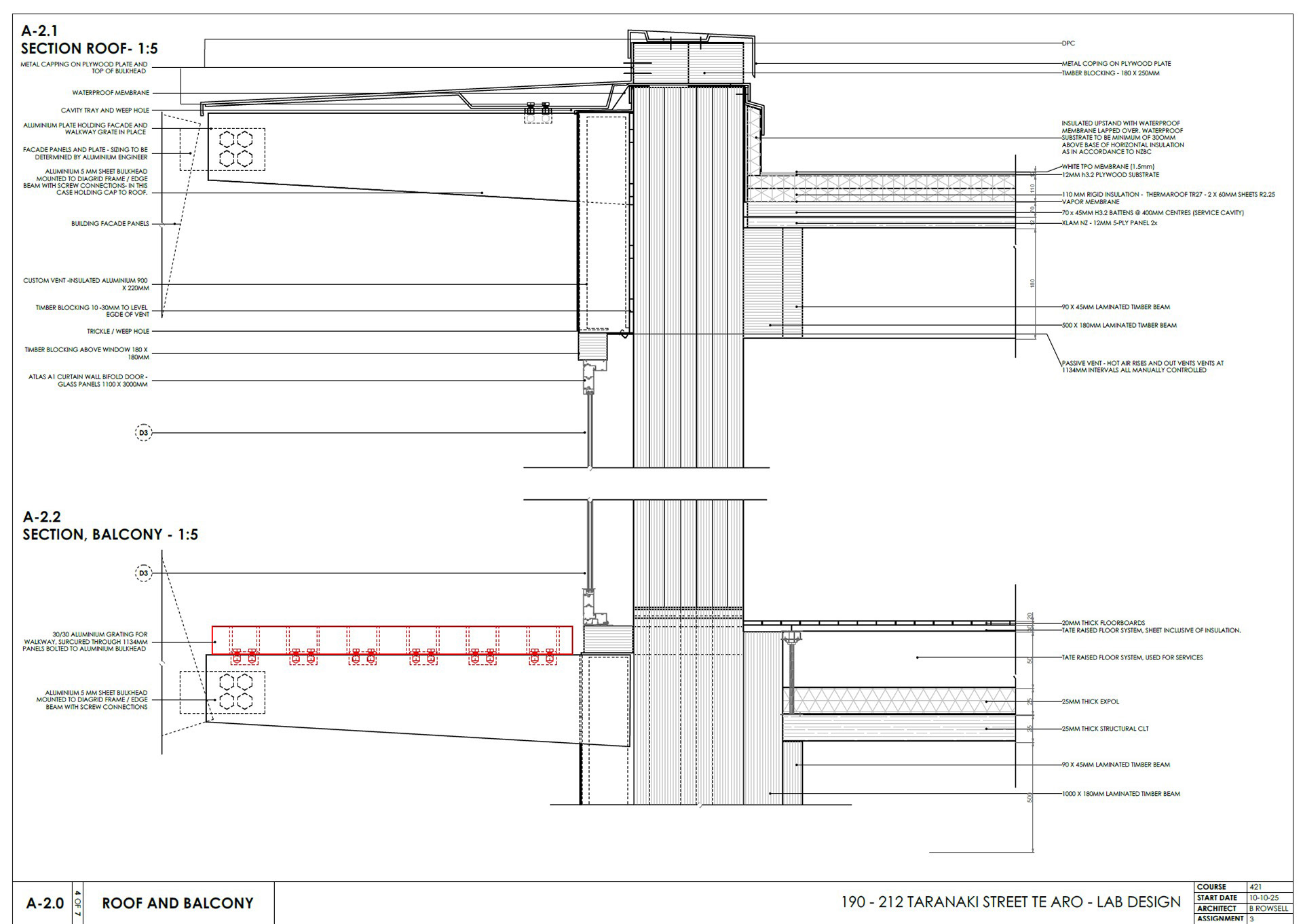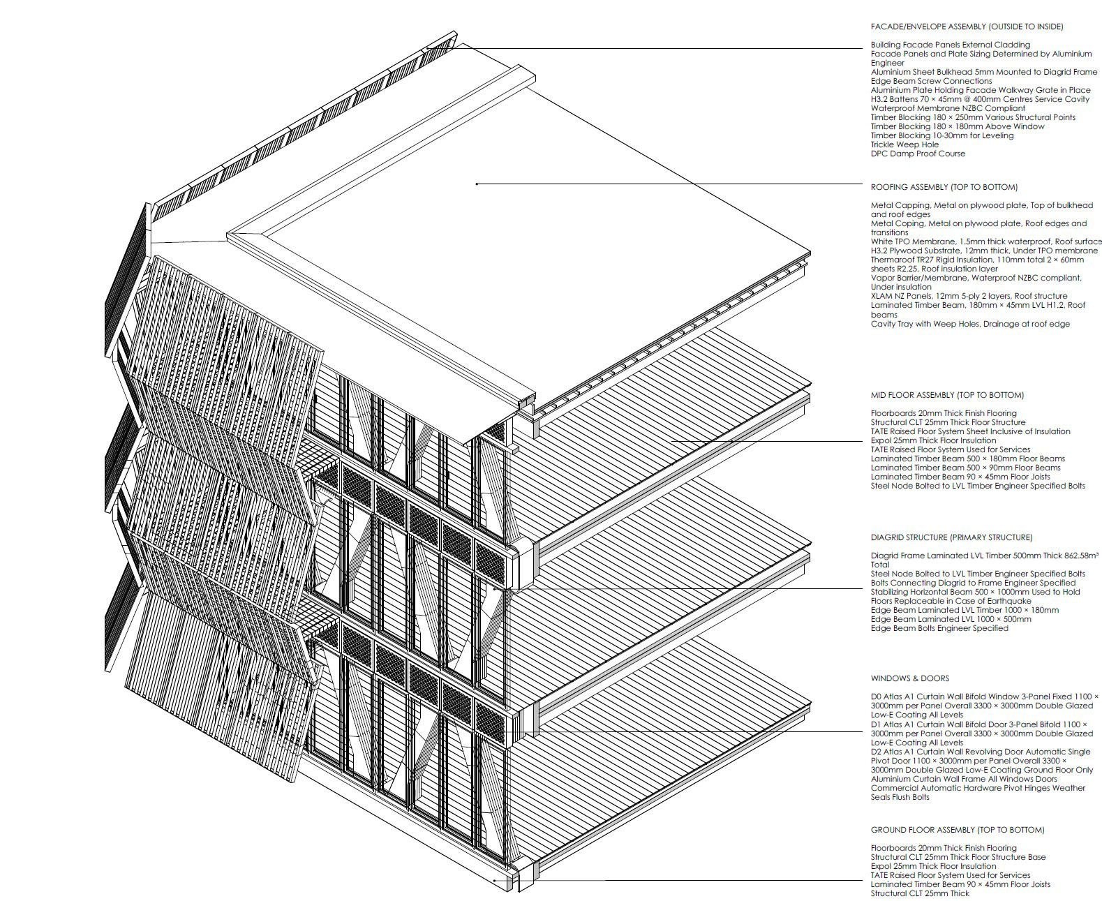 The building envelope integrates performance with narrative through layered assemblies: 5mm aluminum bulkheads mounted to the diagrid frame create the primary weather barrier, while 30/30 aluminum grating at 1134mm intervals forms a maintenance walkway and passive ventilation system. The roof assembly combines XLAM NZ 5-ply panels with 110mm Thermaroof TR27 insulation beneath white TPO membrane. Atlas A1 curtain wall systems (3300×3000mm) with double-glazed Low-E coating provide thermal performance while maintaining visual connections between laboratory spaces and public areas, completing the technical expression of the kete as both container and revelation.