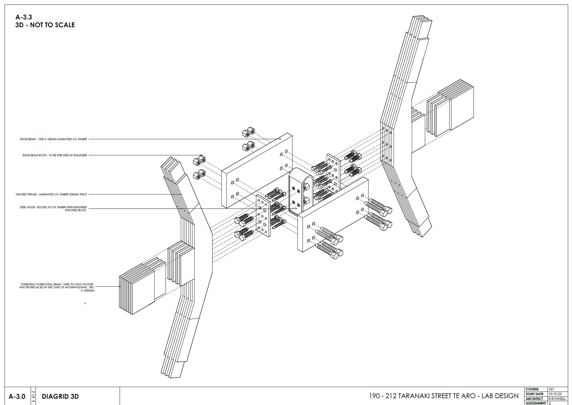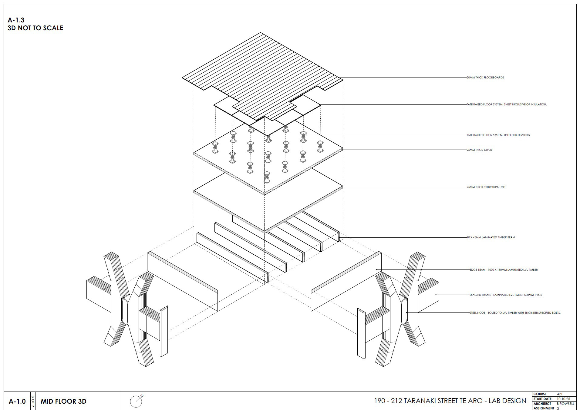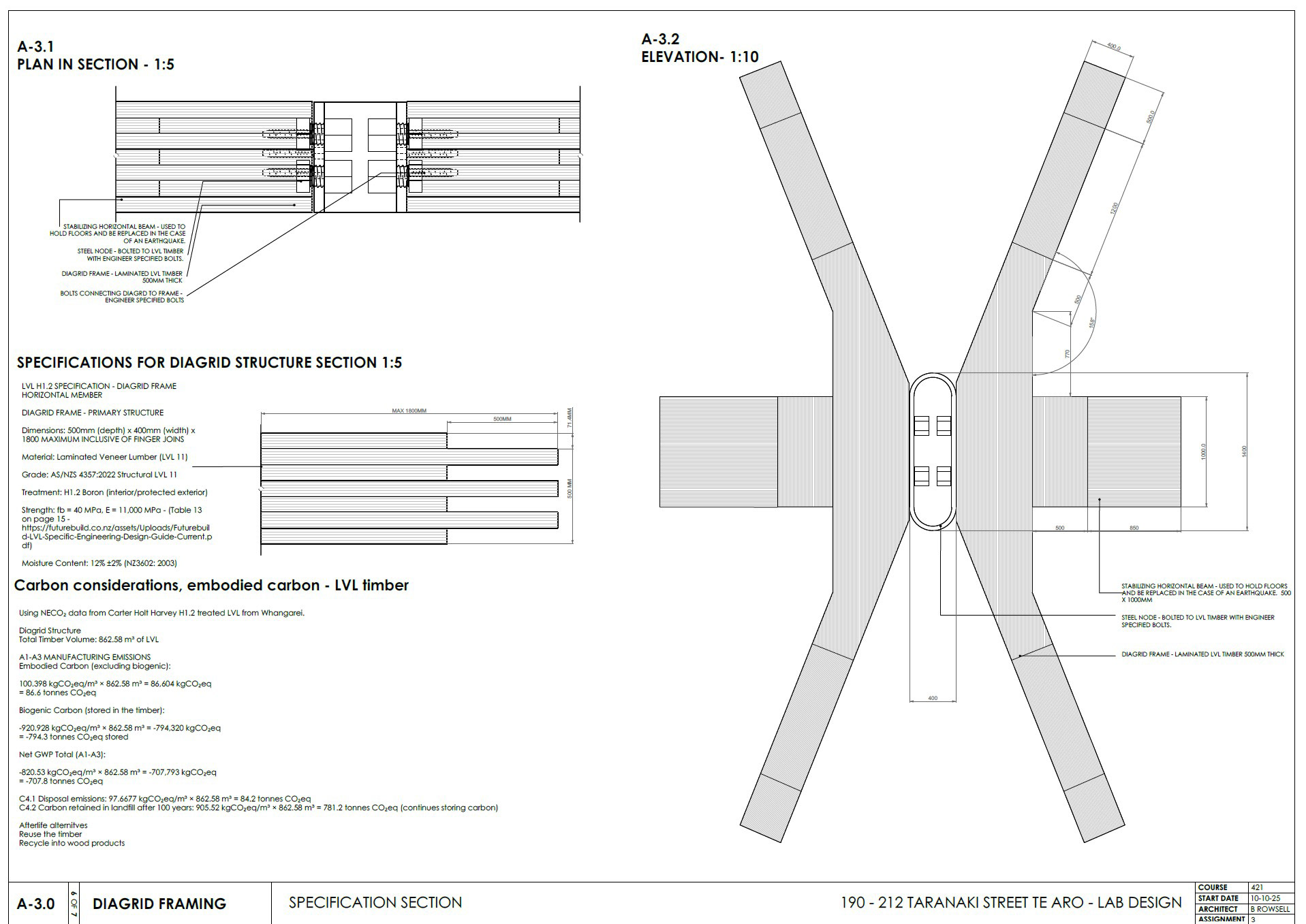 The structural system utilizes 862.58m³ of Carter Holt Harvey LVL timber in a diagrid configuration with 500mm thick members at approximately 18-19° angles. Steel nodes with engineer-specified bolting enable complete disassembly for seismic resilience and end-of-life reuse. Horizontal stabilizing beams (500×1000mm) support CLT floor panels through the TATE raised floor system, creating service distribution while maintaining the structure's inherent flexibility.