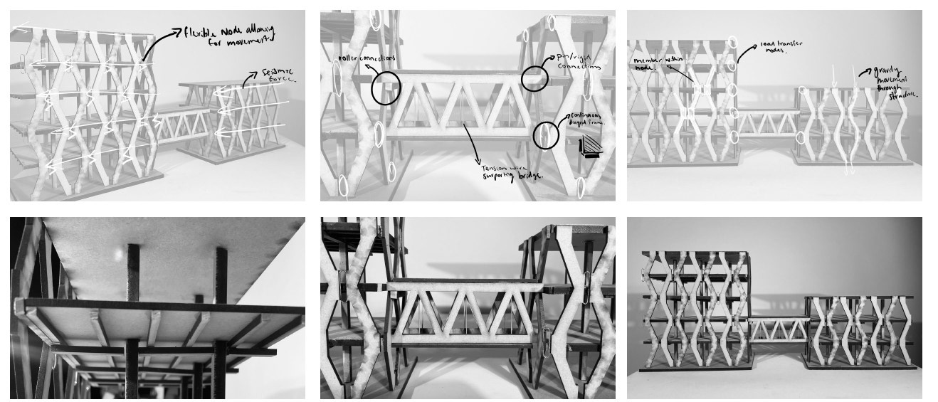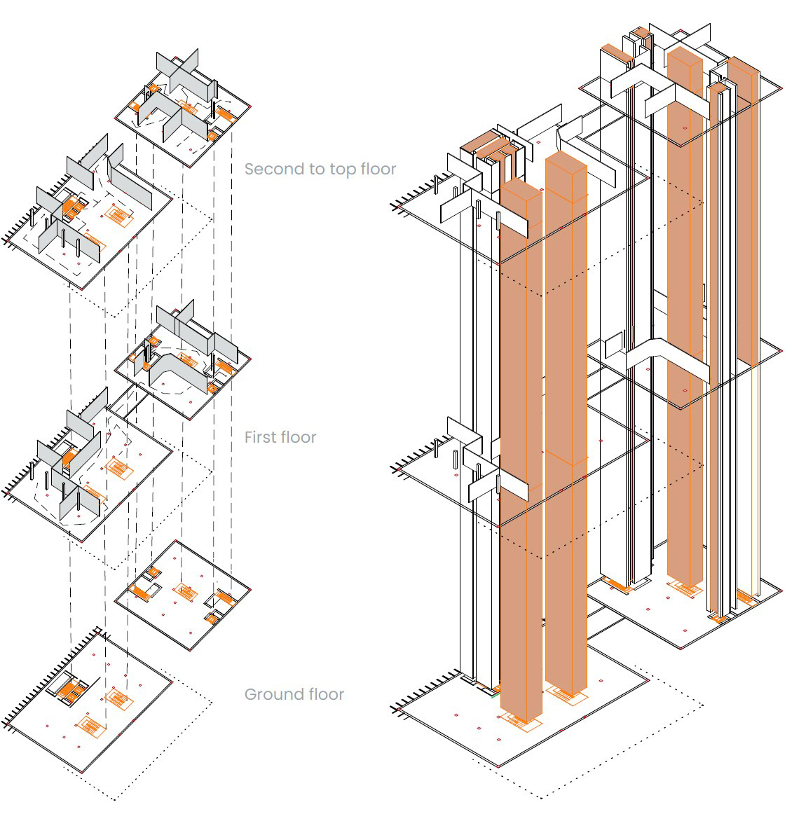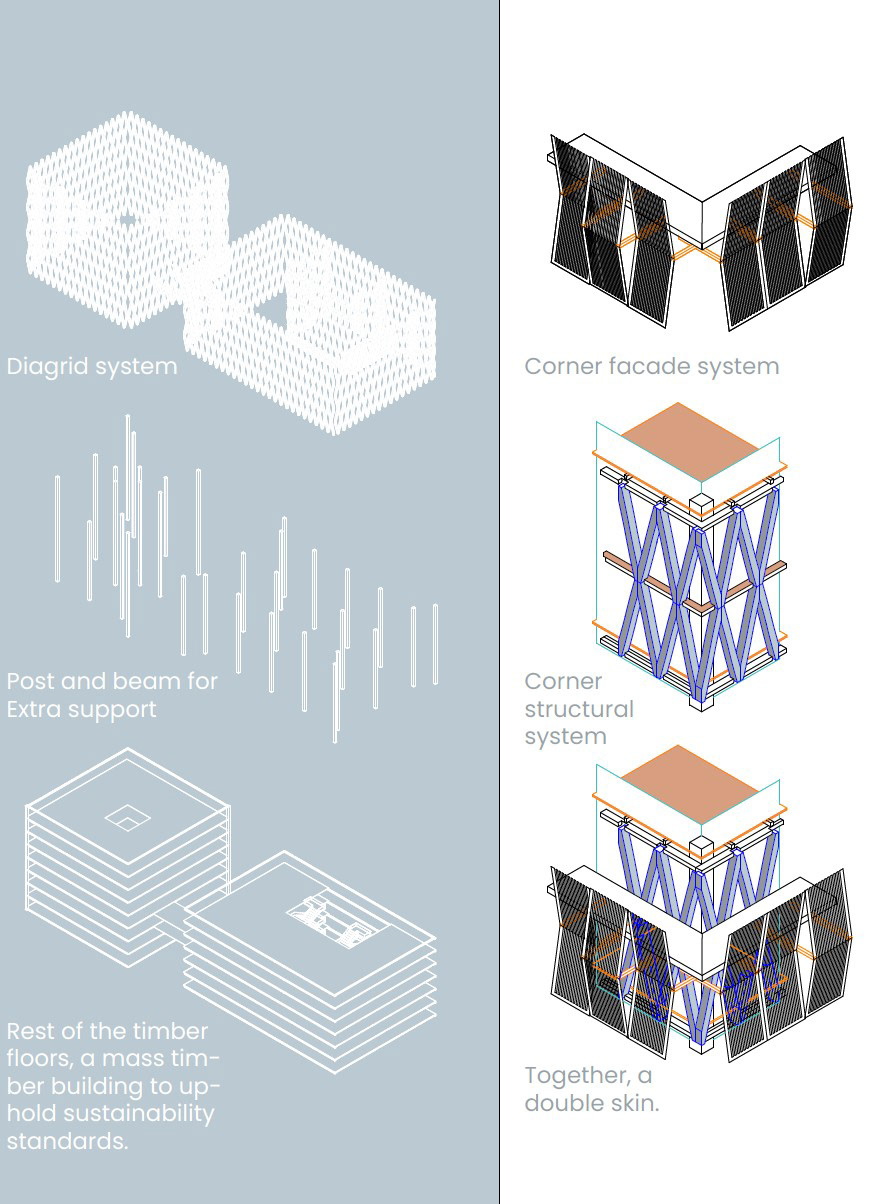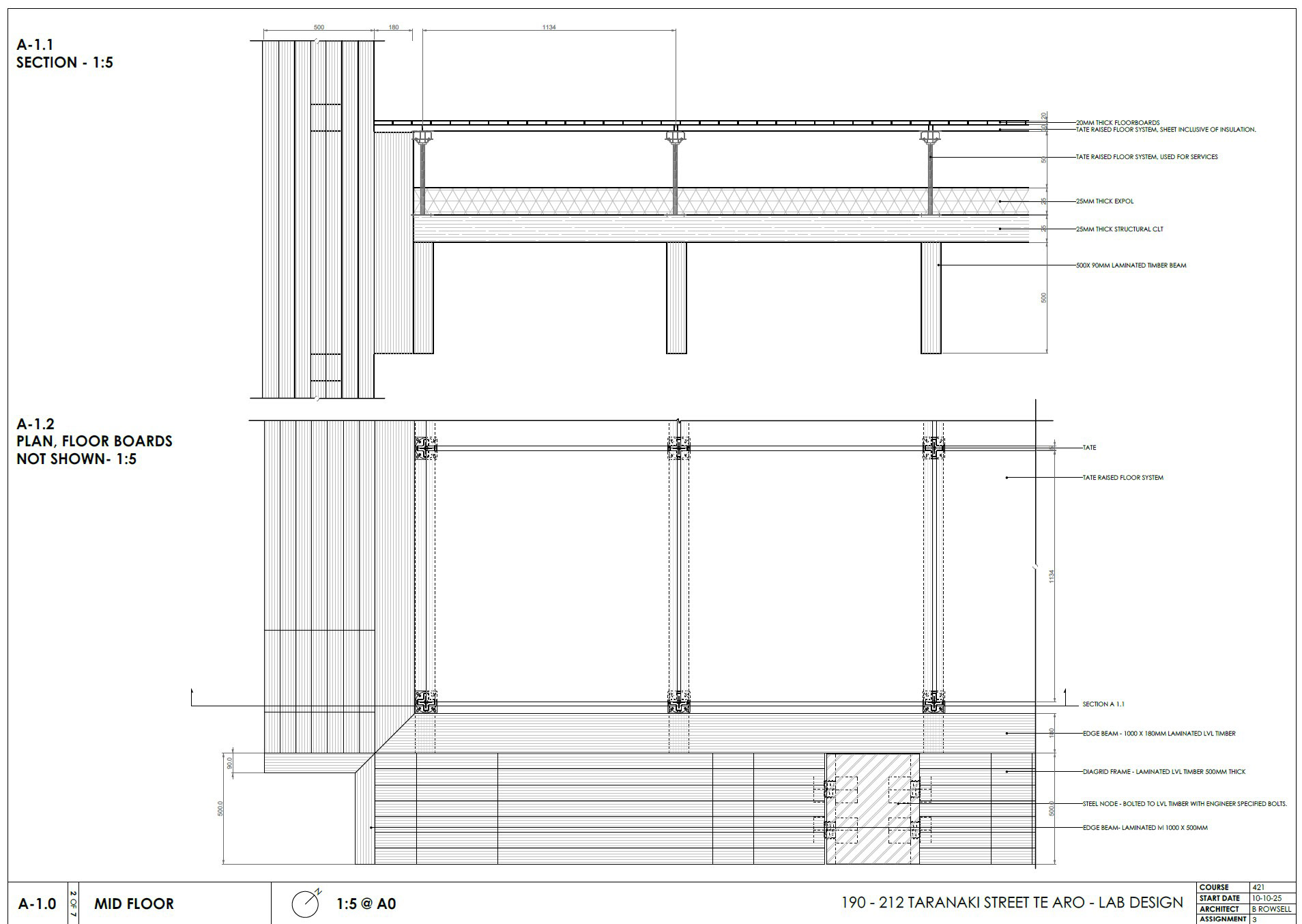 The structural system utilizes 862.58m³ of Carter Holt Harvey LVL timber in a diagrid configuration with 500mm thick members at approximately 18-19° angles. Steel nodes with engineer-specified bolting enable complete disassembly for seismic resilience and end-of-life reuse. Horizontal stabilizing beams (500×1000mm) support CLT floor panels through the TATE raised floor system, creating service distribution while maintaining the structure's inherent flexibility.